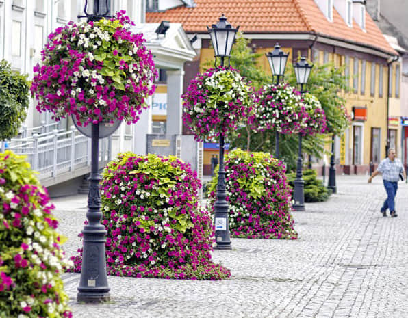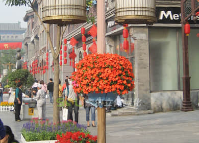 燈桿綠化,考慮到要形成立體景觀及遮擋容器,植物要求以開花植物及藤本植物為主。用時令花草及藤本灌木,形成有層次的有色彩漸變的立體效果。