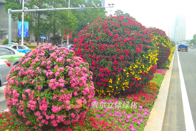 花球既能獨立成景,又可在綠雕中應用,方式多樣。節(jié)日、慶典、會議、活動等重要項目都可運用,用紅色系、橙色系、黃色系等花卉,烘托熱烈氣氛。
